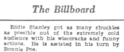 Eddie Stanley got as many chuckles as possible out of the extremely cold audience with his wisecracks and funny action. He is assisted in his turn by Bonnie Poe.