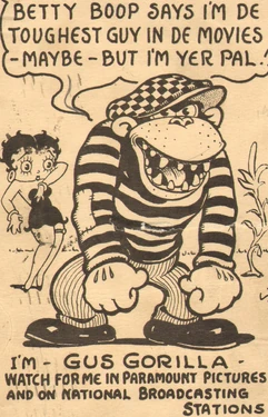 Gus Gorilla is tough character from the Betty Boop series. His earliest known appearance was in the 1930 "Talkartoon" Dizzy Dishes, and he occasionally appears as a background figure in the early Betty Boop cartoons. Gus also makes appearances in The Herring Murder Case and as a plush toy in The Parade of the Wooden Soldiers. He made an appearance on the radio program Betty Boop Frolics. In the animated film Betty Boop's Hallowe'en Party, he made his final cartoon appearance. In it, he goes on the rampage until Betty chases him away with all of her monster buddies. He lastly appeared as a bouncer in the Nintendo DS video game Betty Boop's Double Shift.